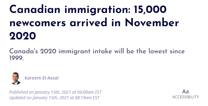 2020年10月底,加拿大宣布一项移民计划,目标是2021-2023年每年接收超过40万新移民,这是加拿大历史上接收最高数量新移民的计划。在加拿大历史上,只有1913年接收的新移民人数超过40万,超过当时人口比例的5%。