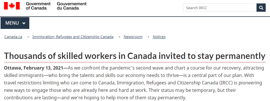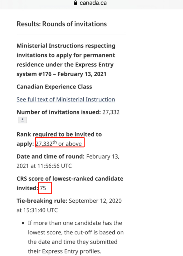 2021年2月13日,加拿大联邦移民部快速通道(Express Entry)移民审理系统针对加拿大经验类别(CEC)进行了最新一次筛选,将池子里的2.7万人全部邀请!本次抽取分数为历史上最低一次,只要75分!