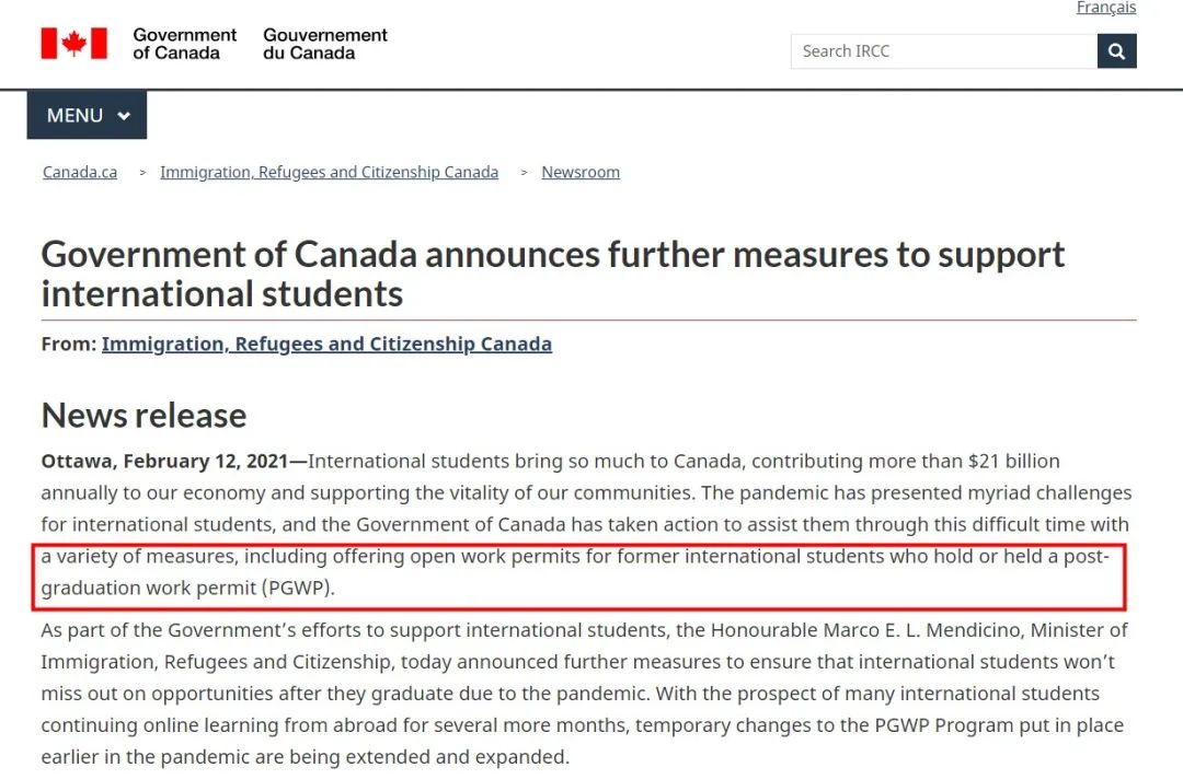 加拿大政府官网也发出了“为留学生提供更多支持”的通知。
