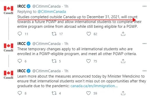 根据加拿大移民局的最新消息显示,在2020年春季-2021年12月31日期间,留学生们在加拿大境外的学习时间都将计入PGWP的有效时间。