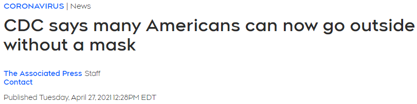 美国疾控中心27日表示,完成新冠疫苗接种人员在不拥挤室外场所可不戴口罩,未接种疫苗者在某些情况下可不戴口罩外出,但强调在室外聚集时和室内场所戴口罩的重要性。