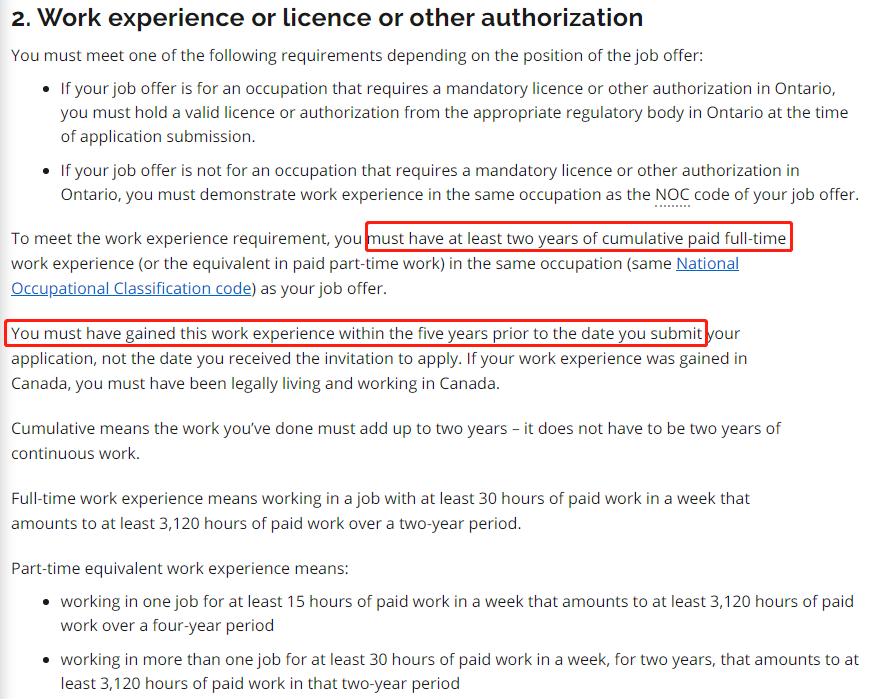 对于外国工人,需要在五年内有两年,安省0或NOC中A、B类,