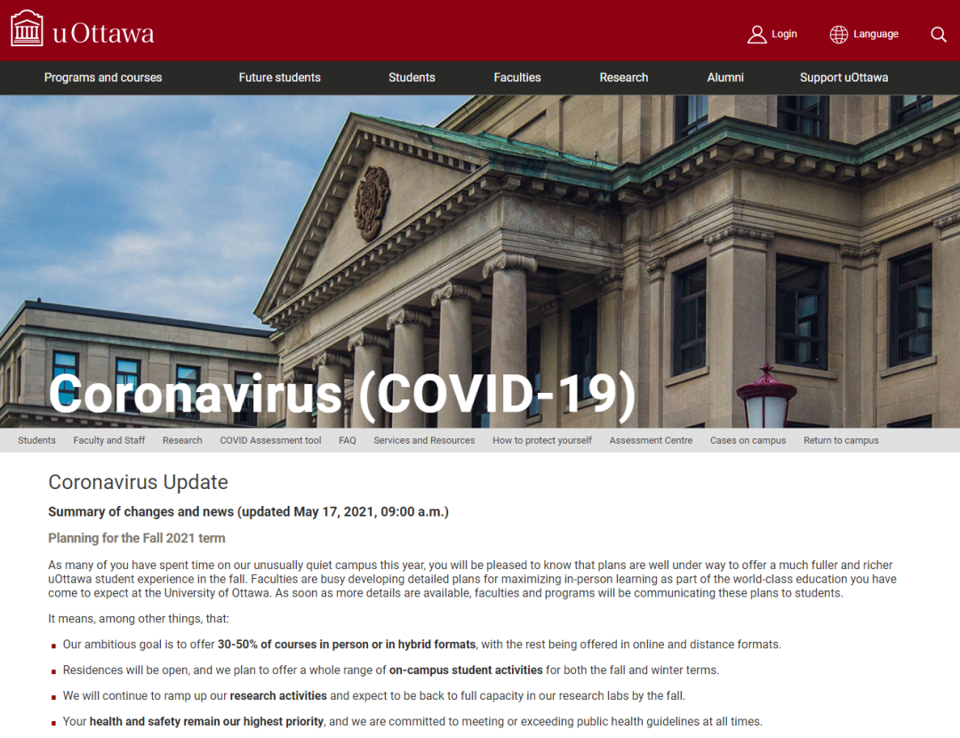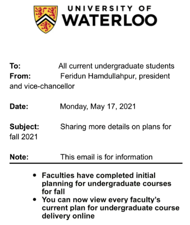 5月17日,滑铁卢大学发邮件更新了对2021 Fall Term秋季学期的课程安排情况。