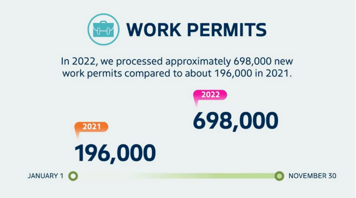 工作许可的审理也有了巨大的改善,截至 11 月 30 日,已审理了近 70 万份工作许可,而在 2019 年的同一时期,在疫情大流行之前,大约有 22.3 万份。