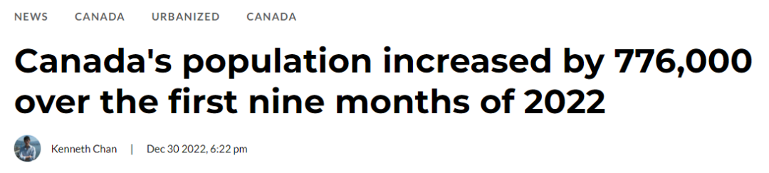 加拿大 2022 年前九个月的总人口增长(+776,217 人)已经超过自 1867 年联邦以来任何全年的总增长。这种高水平的增长主要 (94.0%) 是由于国际移民 (+ 340,666 人),使加拿大人口首次超过 3900 万。在完全计算 10 月至 12 月的数据之后,加拿大 2022 年可能会看到惊人的约 100 万总人口增长。