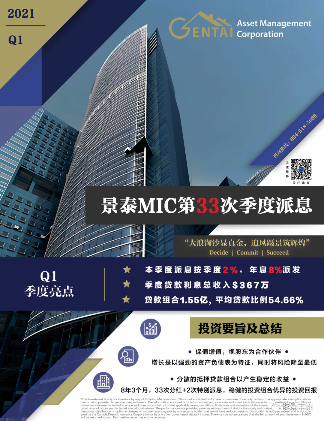 在2021财年第一季度,景泰房屋抵押贷款投资有限公司(景泰MIC)继续保持优异稳健的发展,为股东创造了稳定的单利8%,复利8.24%的高回报年收益。这是景泰自创立8年3个月以来,为股东创造的连续第33次的稳定派息,稳稳的现金流收益。