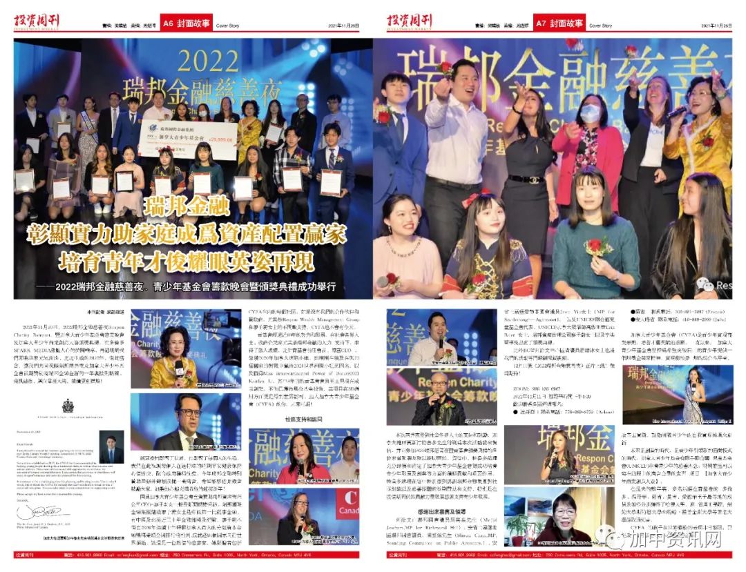 2021年11月20日,2022瑞邦金融慈善夜Respon Charity Banquet, 暨加拿大青少年基金会慈善晚会及加拿大青少年商业创意大赛颁奖典礼,在多伦多SPARK MEDIA激动人心的拉开帷幕。再过几周我们即将迎来元气满满、虎虎生威的2022年。借此盛会,让我们共同祝愿瑞邦慈善夜及加拿大青少年基金会长期赞助商瑞邦金融在新的一年里披荆斩棘、乘风破浪、迈向星辰大海,业绩更创辉煌!