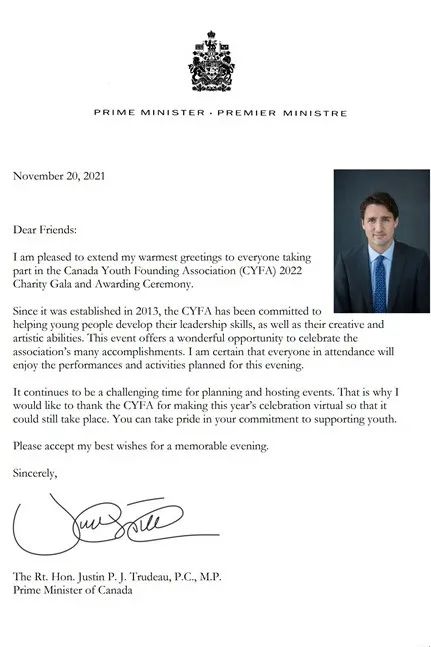本次慈善夜受到社会各界人士的支持和鼓励,加拿大总理贾斯汀特鲁多先生特别为本次活动发来贺信,并向参加2022瑞邦慈善夜暨青基会颁奖典礼的各位来宾和朋友致以亲切问候,贺信中,特鲁多总理充分评价和肯定了加拿大青少年基金会对成功培养青少年发展及创业等方面的积极贡献和重要作用。特鲁多总理在信中特别提到感谢瑞邦金融集团对社团组织以及慈善团体的长期赞助和支持,特别是在疫情期间仍然贡献力量发展慈善支持青少年发展。