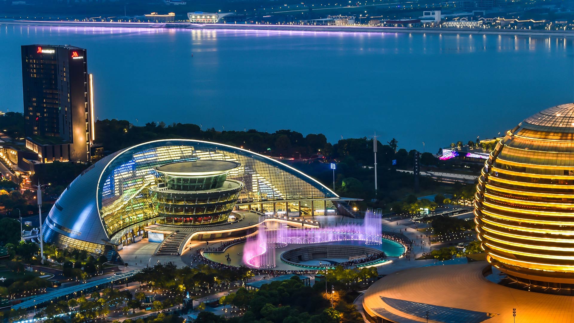 杭州大剧院灯光璀璨(8月31日摄)。临近G20杭州峰会,杭州夜色柔美,灯光璀璨。9月4日至5日,二十国集团(G