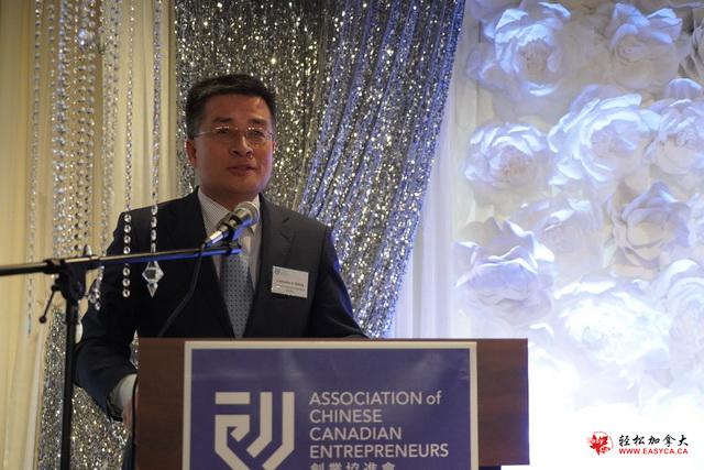 中国驻多伦多总领馆鄂德峰参赞致辞,感谢创业协进会组织这次活动,也感谢三位演讲者对加中贸易做出的杰出贡献,希望在场的各位创业者亦能坚持推广加中商务贸易。