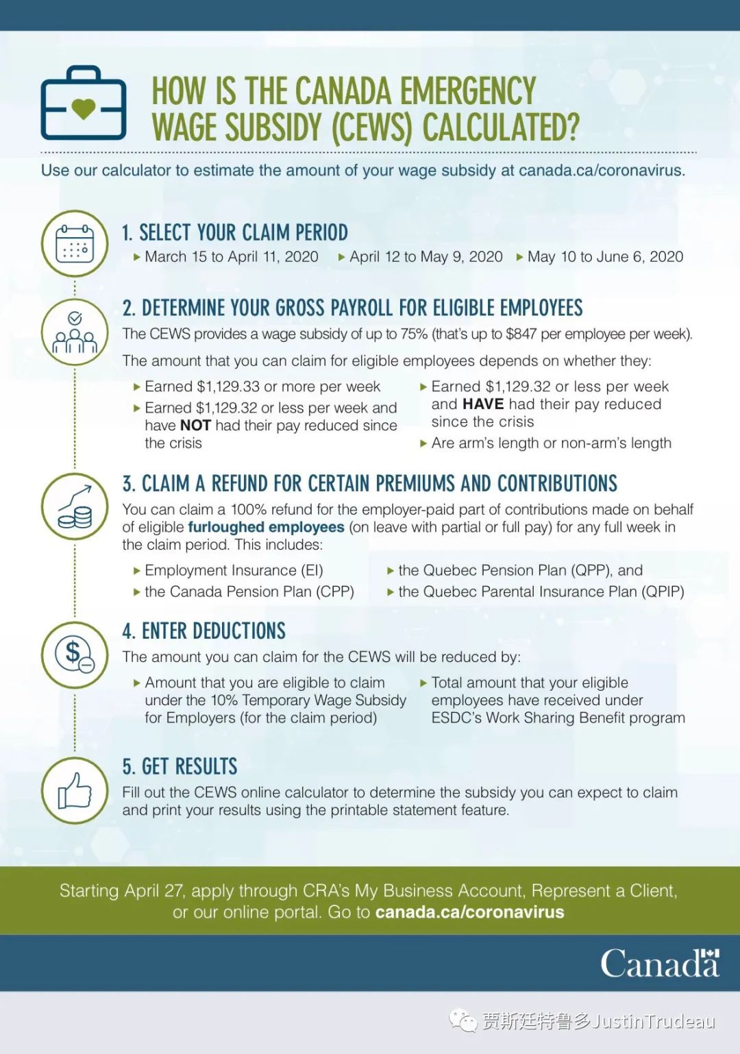 CEWS为符合资格的雇主提供最高达75%的工资补贴(这相当于每个员工每周最高补贴847加元),最长时间为12周,追溯到2020年3月15日开始。