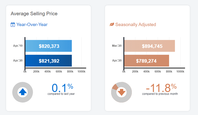 以大多伦多地区而言,四月份的房屋销售量暴跌了67%,该月的均价在季节调整后比3月份下跌11.8%,比一年前同月的价格只多了0.1%。