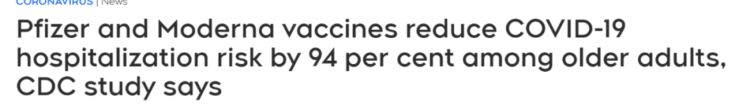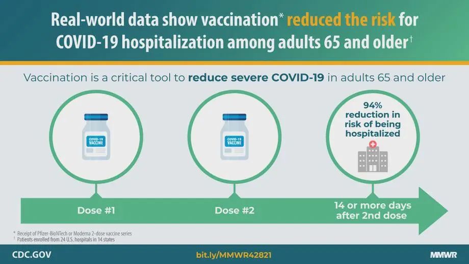 美国疾控中心CDC的数据显示,在接种辉瑞或莫德纳两针疫苗后,65岁以上人群的住院风险降低了94%。