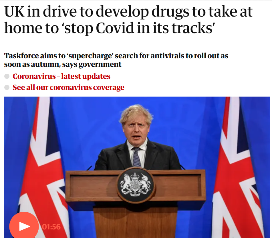 在首相鲍里斯的强力支持下,英国政府正在成立一个抗病毒工作小组,要在今年秋天前,至少推出2种有效的新冠治疗方法,以片剂、胶囊、口腔喷雾等多种剂型出现,如果人们不幸感染新冠,在家即可服用治疗,阻止病情发展,并可缩短康复时间、大大降低转为重症的可能性。