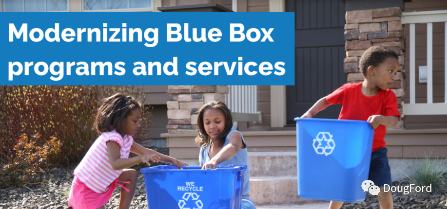 省府在广泛咨询民意后,决定以如下方式改革蓝色回收桶计划(Blue Box program):将更多社区纳入回收服务范围,并将全省可回收的材料清单标准化,同时还令产品和包装生产商完全负责该计划的成本和运作,从而为市政当局节省资金。