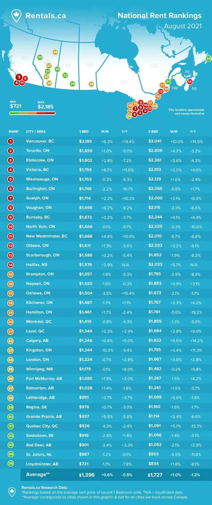 根据Rentals.ca发布的加拿大8月租金排名显示:多伦多一房公寓的平均租金为$1855,两房公寓的平均租金为$2606,位居全国第二。