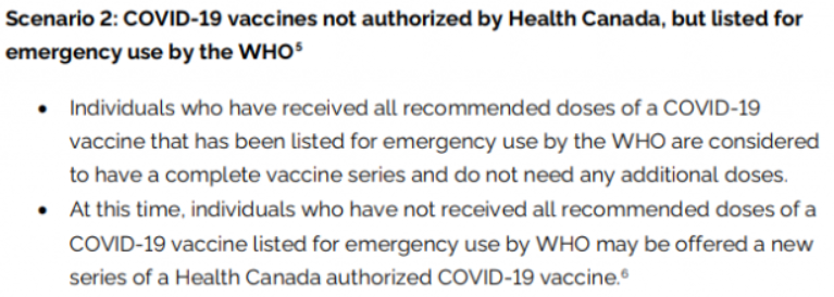 文件明确指出,如果你接种的不是加拿大官方认可的疫苗,但属于已被世卫批准紧急使用的疫苗,那就被视为已经完成了疫苗接种。