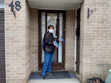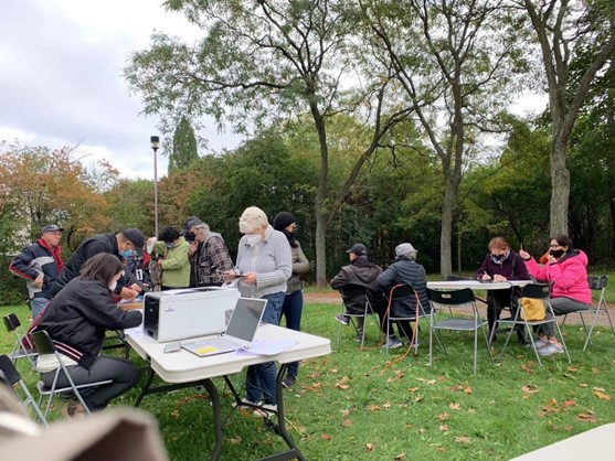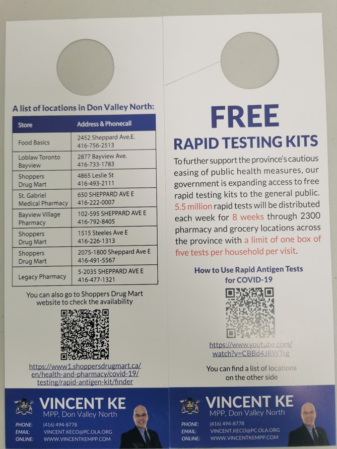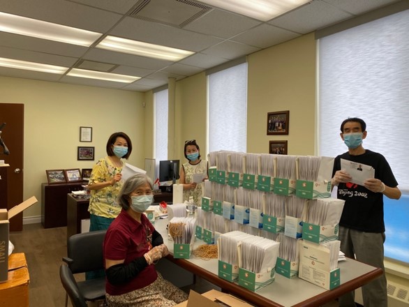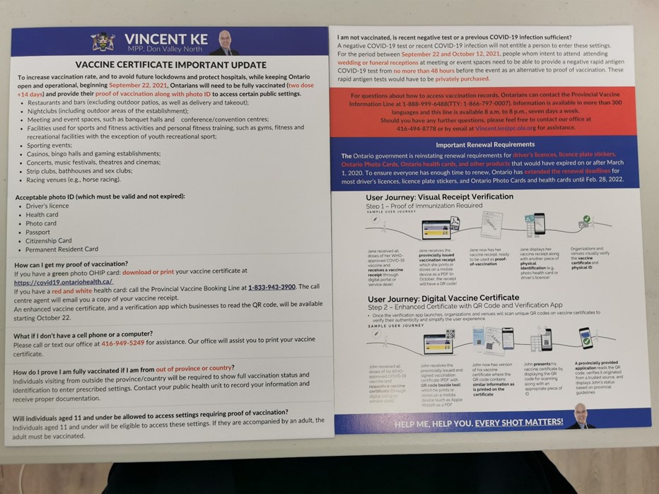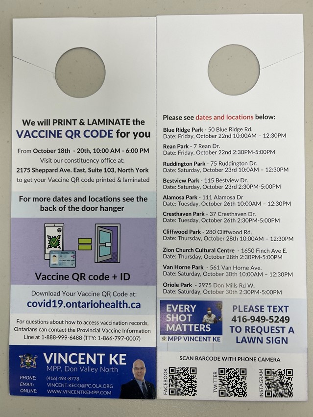 我的办公室组织义工在疫情期间多次分发口罩和消毒液,举办27次疫苗证书打印活动, 通过发放传单,通知选民活动时间、地点信息,为5000多位选民下载、打印并塑封疫苗证书。