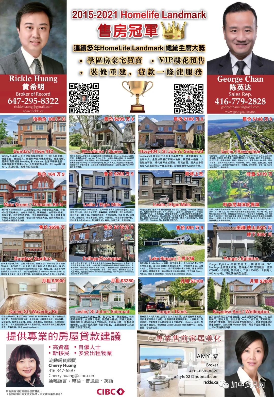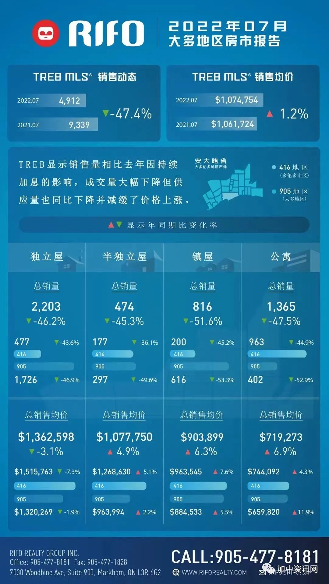 镇屋:总销量较去年同期平均综合下降51.6%,416地区销售降45.2%,而905地区降53.3%。七月份总销售均价涨6.3%,416地区涨7.6%,而905地区涨5.5%。