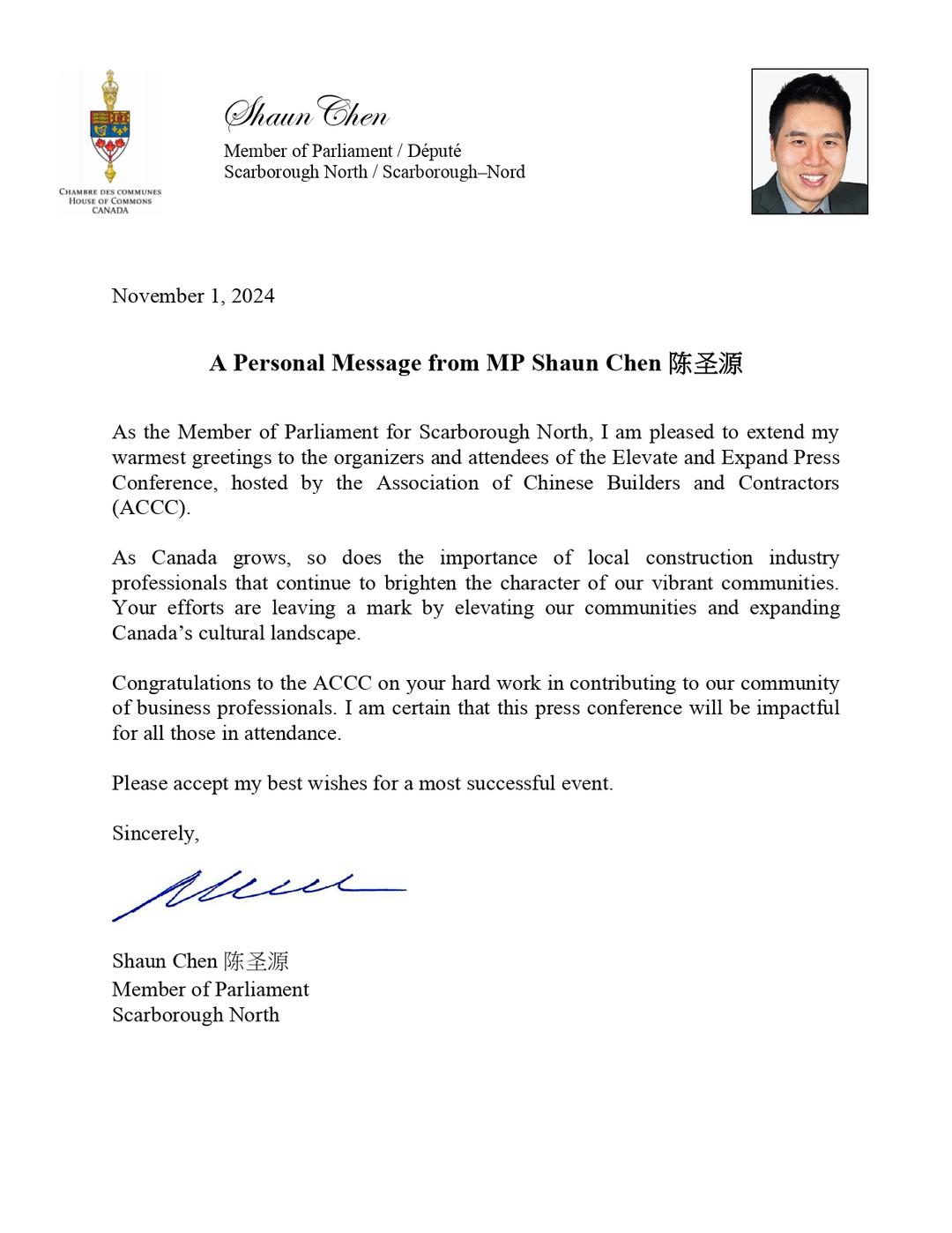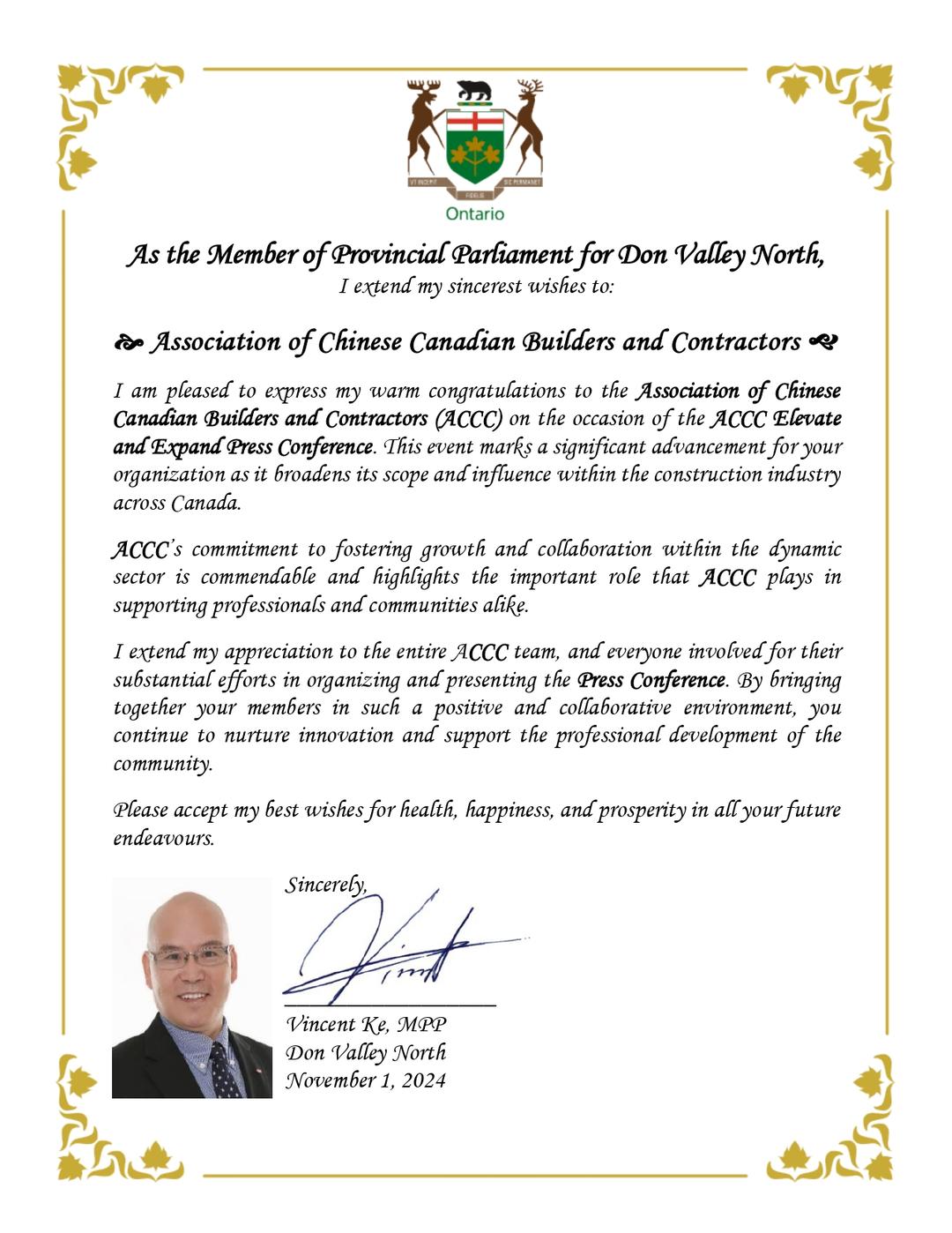 安省省议员柯文彬助理Tina Zhang代表柯文彬议员致赠贺函