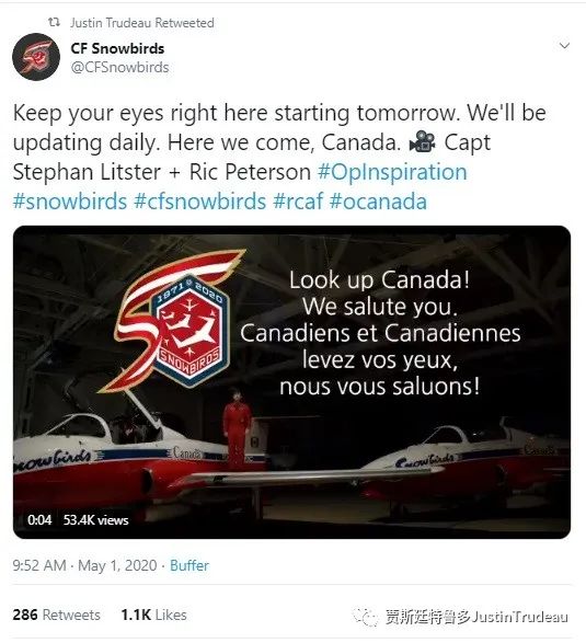 加拿大军队的雪鸟飞行队飞越全国,向尽自己一份力量抗击COVID-19疫情的加拿大人致敬。这个独特的任务被恰当地定名为“激励行动Operation INSPIRATION”。