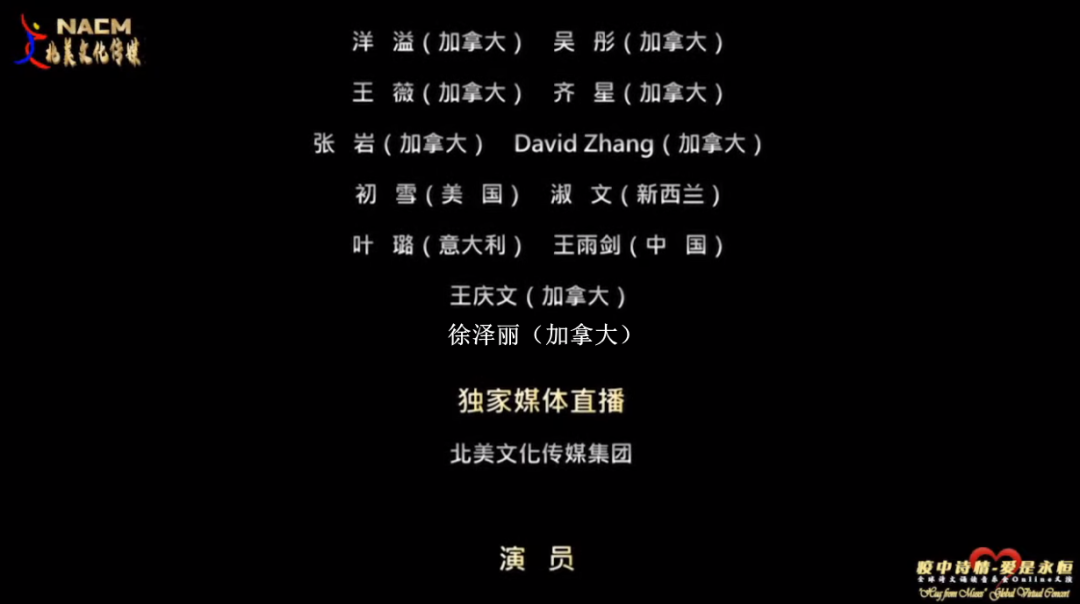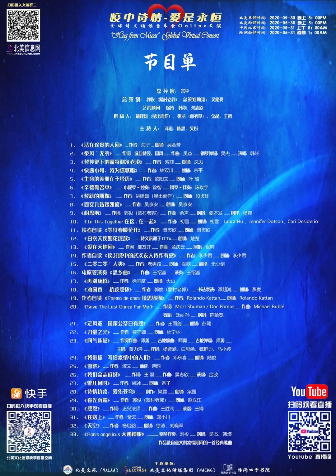 “疫中诗情 - 爱是永恒”的演出活动由中国国家一级演员、朗诵艺术家宗平总导演,北美文苑主席、华裔诗人郭俊总策划,与总策划助理吴路曼一起,视频连线现场表演人员,采用最新的云端形式全球直播。
