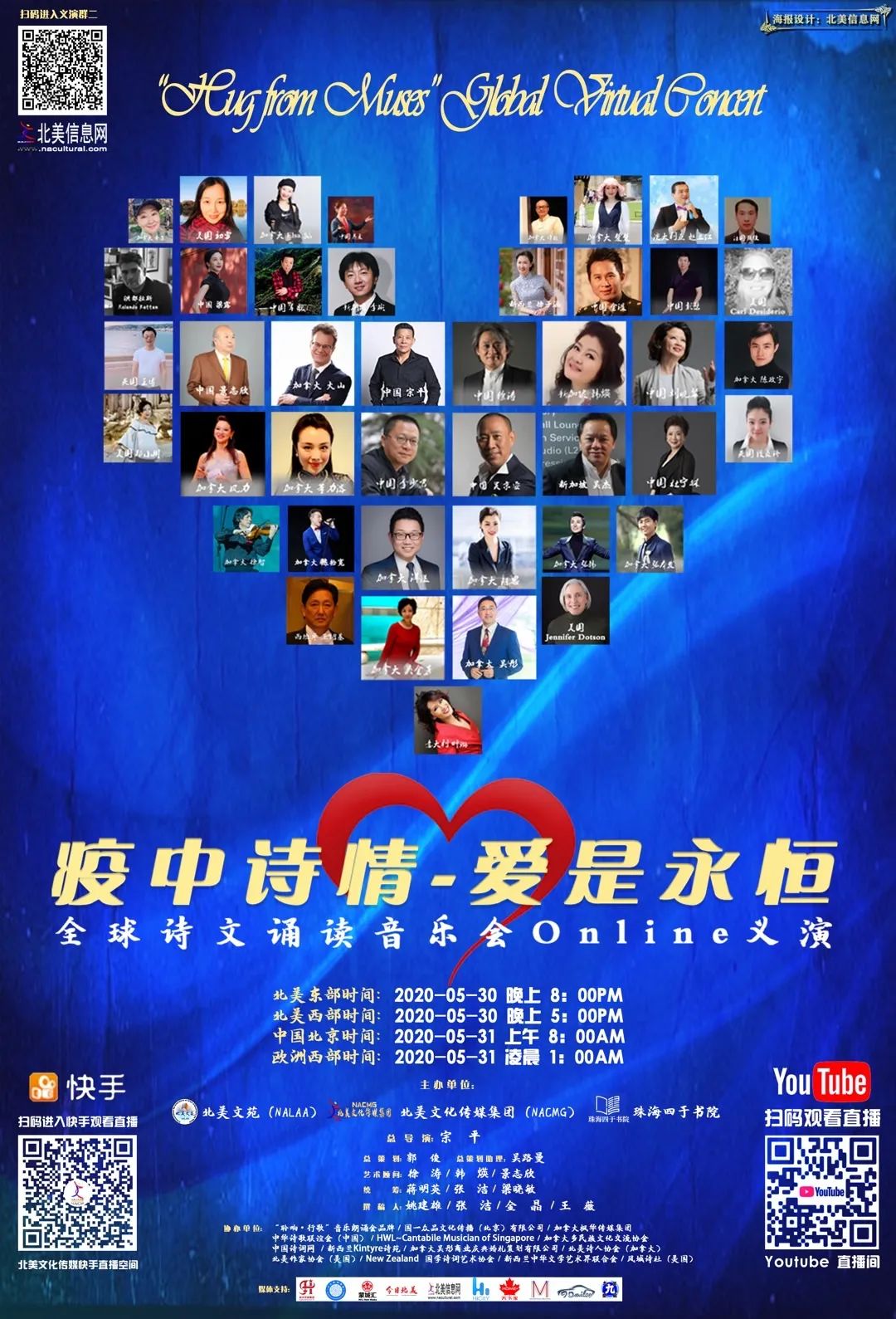 疫情当前,病毒无情,人间有爱。为此,由北美文苑、北美文化传媒集团、珠海四于书院联合主办的“疫中诗情-爱是永恒”全球诗文诵读音乐会Online义演活动于5月30日北美东部时间20:00PM隆重直播。众多的艺术家们,文艺协会和诗词爱好者们,用精心准备的方式,向医护人员们致以他们最崇高的敬意。将绵绵不绝的爱心传递给疫情中和疫情后的人们。