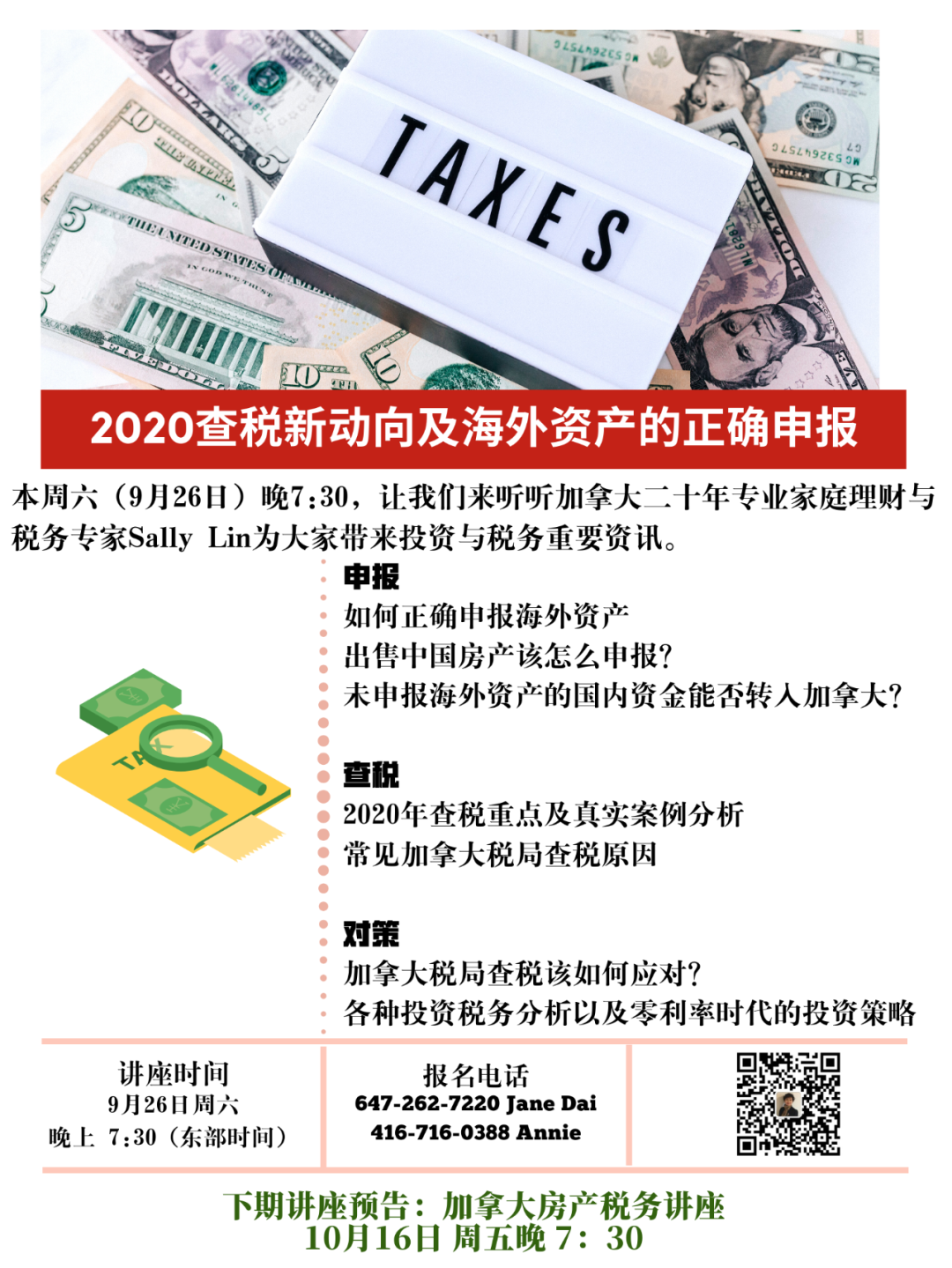 本周六(9月26日)晚上7:30,专家与您相约!让我们来听听加拿大二十年专业家庭理财与税务专家SallyLin,为大家带来税务及海外资产申报的重要资讯分享。