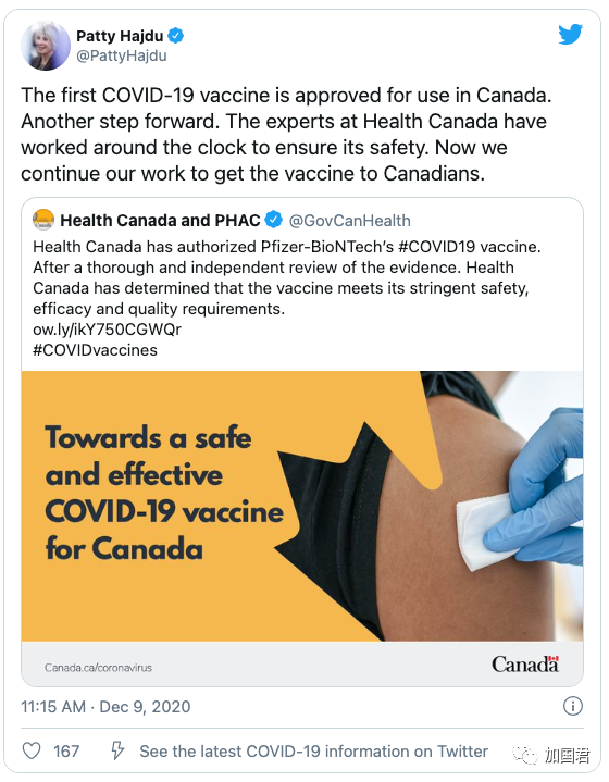 我很高兴地宣布,在这个即将成为历史上规模最大的疫苗接种行动中,加拿大🇨🇦及早起步捷足先登,将收到辉瑞公司提供的249,000剂COVID-19疫苗。