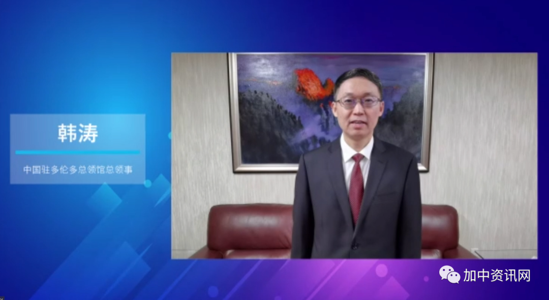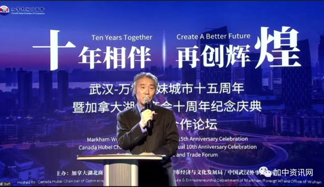 庆祝活动之后,还举行了一个题为“后疫情时代经济重建与合作”加中经贸合作论坛,包括主题演讲和圆桌讨论。万锦市经济文化发展委员会主席何胡景,CIK Business Solution总经理Benjamin Xiao,沃尔玛全球供应链高级经理David Liao,北美电商SaaS平台Expancio.com CEO Peter Zheng,湖北省总商会副会长、楚商联合会执行会长、九州通集团名誉董事长刘宝林, 湖北海外楚商联合会会长、美国湖北商会会长、伟鹏集团董事长喻鹏,中国建设银行国际业务部副总经理胡波飞,湖北省恩施商会副会长、广博时代控股董事长邓明锋等就加中经贸发展等问题进行了深入探讨。