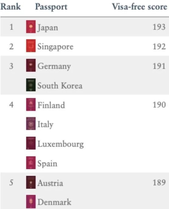 亨利护照指数是根据持有人无需事先签证即可进入的目的地数量对世界所有护照进行的原始排名。根据该网站,“排名是基于国际航空运输协会(IATA)的独家数据,该协会维护着全球最大,最准确的旅行信息数据库。