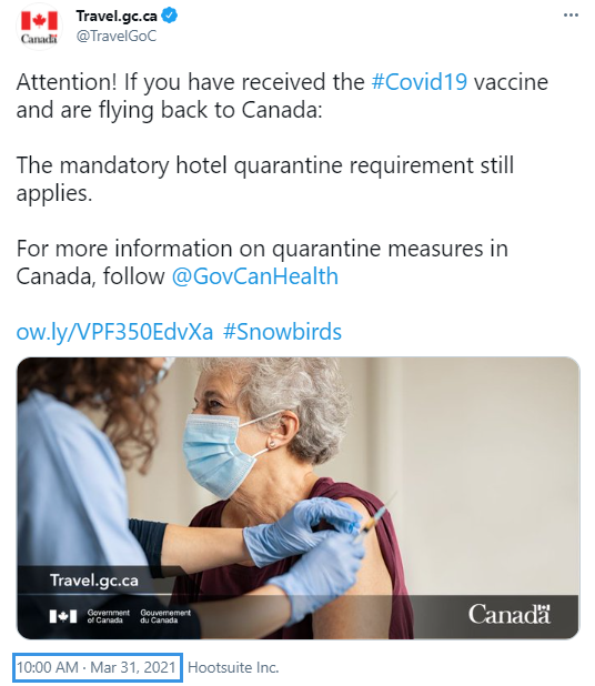 所以,加拿大联邦政府的这份提醒,只是强调此项规定尚未因疫苗接种逐渐普及而有变化,因为所有作“非必需”航空旅行的旅客仍必须完成强制性的酒店隔离,无关其是否接种过疫苗。