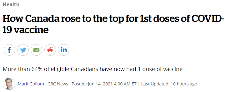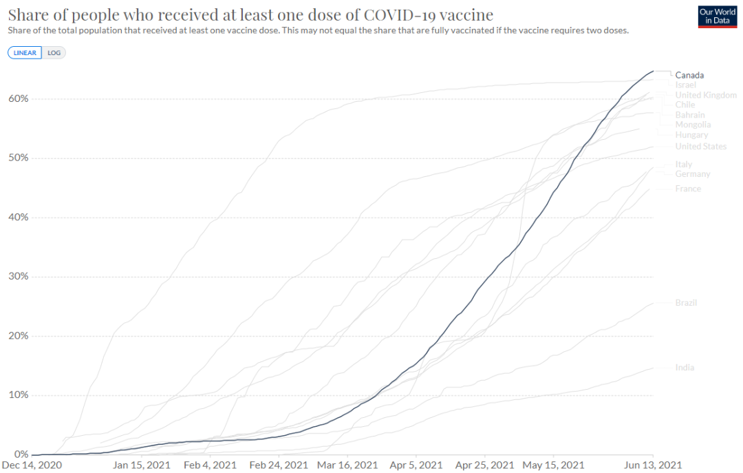 ¸ù¾ÝÔÚÏßÑо¿³ö°æÎï¡¶Our World in Data¡·µÄÊý¾Ý£¬½ØÖÁ6ÔÂ13ÈÕ£¬¼ÓÄôóÒѾÏò³¬¹ý64.73%µÄ¹úÃñ½ÓÖÖÁËÖÁÉÙÒ»¼ÁÒßÃ磬³¬¹ýÒÔÉ«ÁеÄ63.3%£¬Î»¾ÓÈ«Çò°ñÊס£