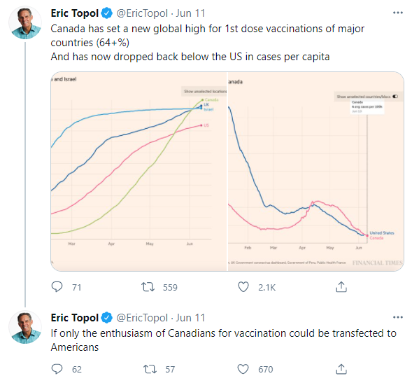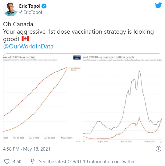 ÔçÔÚ5ÔÂÖÐÑ®£¬Eric Topol»¹ÔÚÍÆÌØÉÏ˵£º“Oh Canada£¡ÄãÃǵÄÒ»¼ÁÒßÃç½ÓÖÖ²ßÂÔ¿´ÆðÀ´³¬°ô£¡”