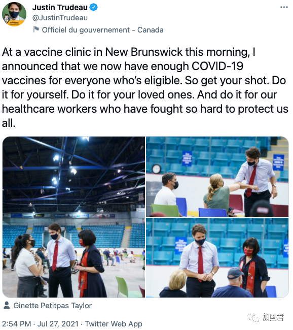 特鲁多总理说:“每个人都有足够的剂量,没有更多的借口不接种。为自己接种吧,因为没有人想患病,而现在患病的是未接种疫苗和部分接种疫苗的人。”