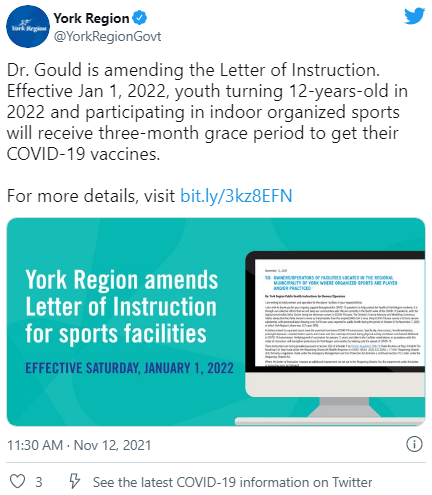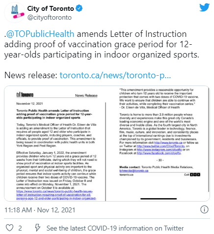 多伦多、皮尔区和约克区的公共卫生局对“将于2022年年满12岁的儿童”修订了COVID-19疫苗政策,要求这些儿童打疫苗才能参加室内有组织运动。