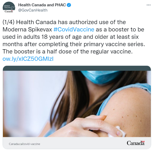 加拿大卫生部批准Moderna加强剂,剂量减半!