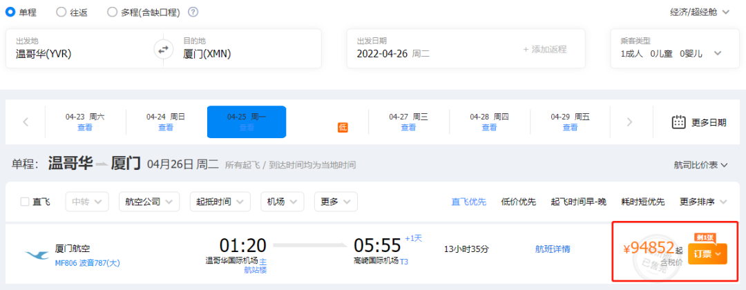 目前,从温哥华起飞在厦门入境的航班机票数量紧张,能在5月9日之前,赶上试运行“10+7”政策的航班仅有4月26日的厦门航空。
