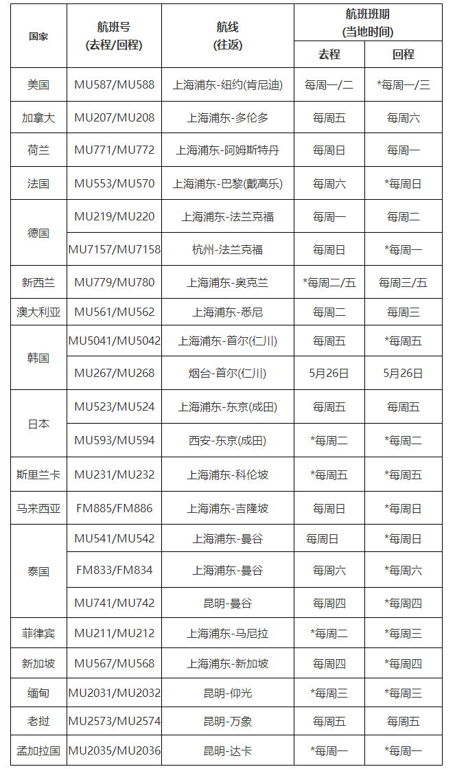 自2022年5月1日0时至2022年5月31日24时,东航、上航每周可执行国际航线累计21条。具体航班计划如下: