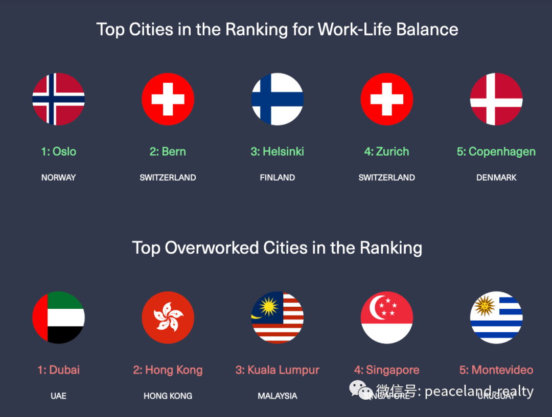 反之,亚洲多个地方则被评为工作和生活平衡表现最不好的地方,本次排名前五为: