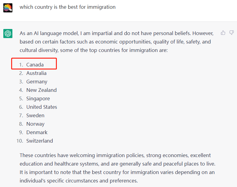当我们向它提问“哪个国家适合移民”时,它基于多方面因素,给出了一个简单的10个国家排名。其中,加拿大排在第一。