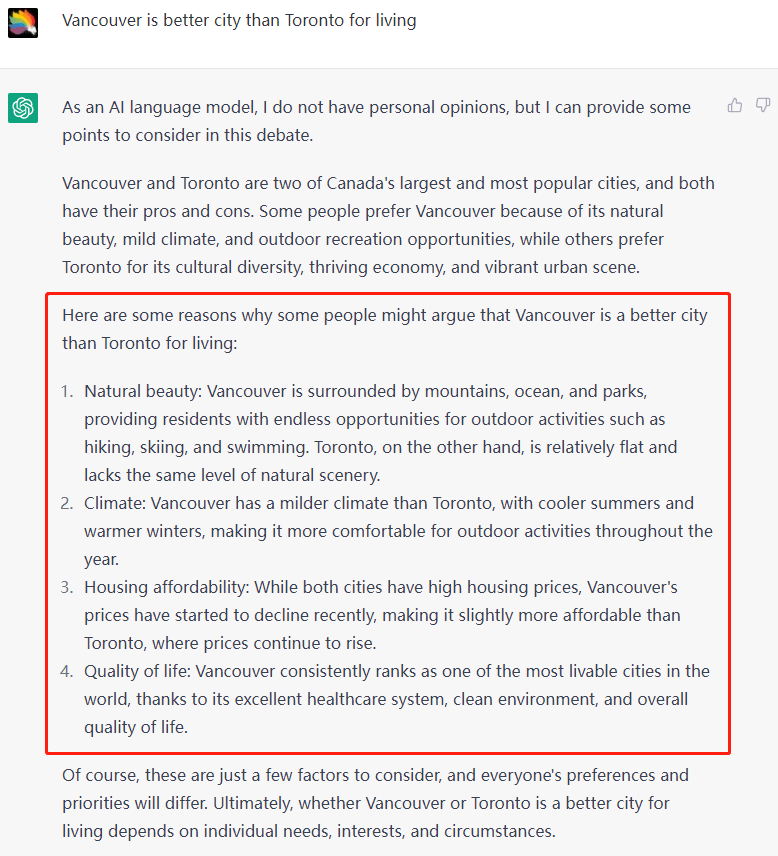 首先,我们提问“温哥华是比多伦多更好的城市吗”。结果,它表示自己无法像人类一样给出一个观点,但是列出了两个城市各自的优点:温哥华有自然美景、温和天气和户外娱乐活动;多伦多的特色是多元文化、充满活力的艺术和文化景点和繁华的城市氛围。