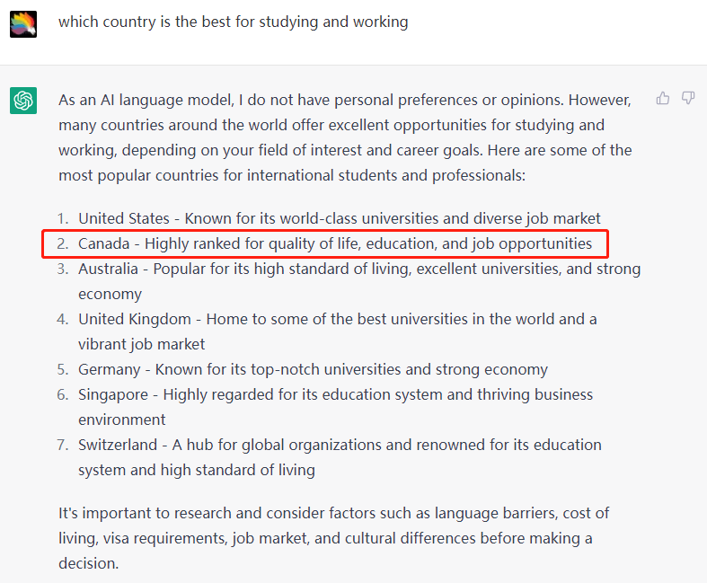 再当我们提问“哪个国家适合学习和工作”时,它又给出了一个7个国家的排名。这些国家很受留学生和职业人士的欢迎。其中,加拿大位居第二,并且它指出,加拿大因其生活质量,教育和工作机会而获得如此靠前的排名。