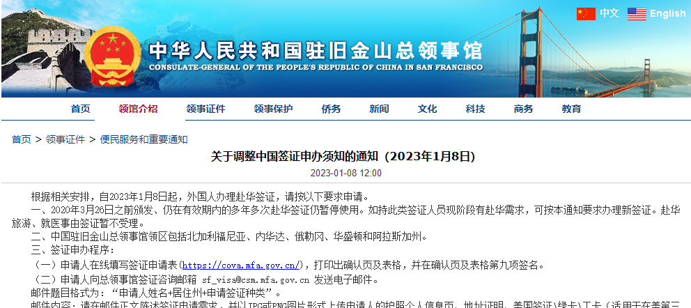 记者在截稿前查阅中国驻加拿大大使馆和中国驻多伦多总领馆网站,目前还没有最新消息的更新。但中国驻美大使馆和中国驻旧金山总领馆已在1月8日发布关于最新签证申请要求的通知。
