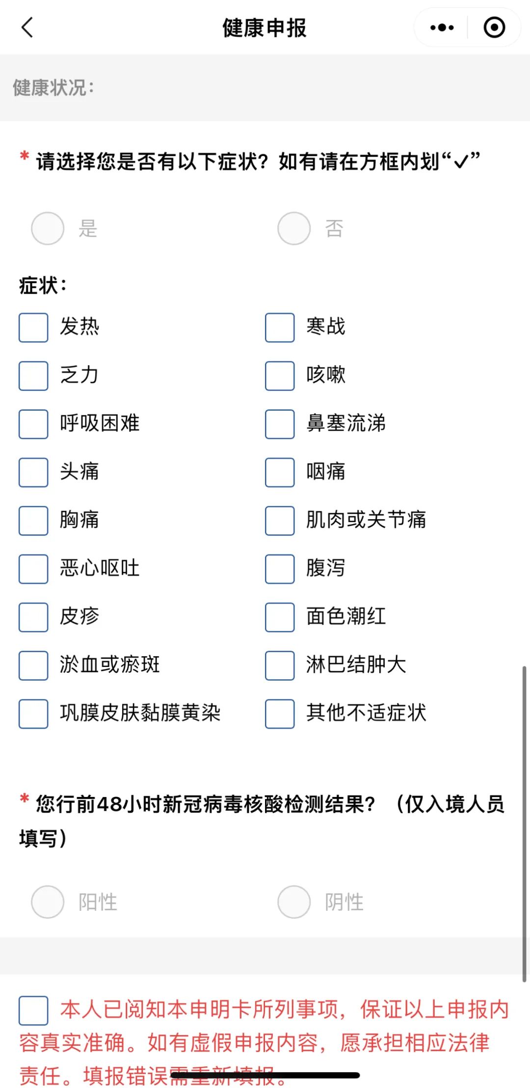 在填写出入境人员海关健康申报表时,需要填写是否有以前症状以及行前48小时新冠病毒核酸检测结果为阴性还是阳性。