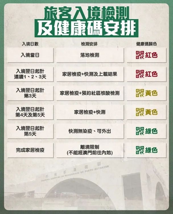 2)入境翌日起计第3天上载快速抗原检测阴性结果后,〝澳门健康码〞转为黄码,当天应自行预约社区核酸站进行单样核酸检测,否则〝澳门健康码〞会转为红码; 3)入境翌日起计第4天及第5天,继续每天进行快速抗原检测;连续2天快速抗原检测阴性后,〝澳门健康码〞转为绿码;