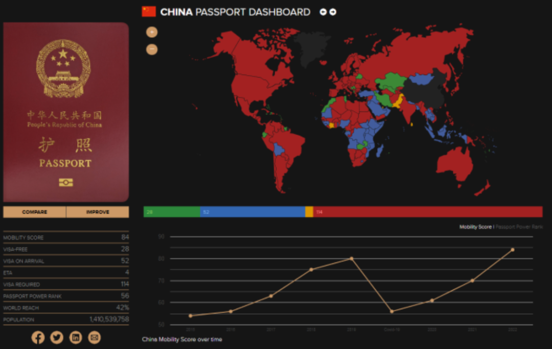 根据今年的报告统计,中国护照持有者可免签入境的国家有28个,52个国家可落地签,需要签证的国家有114个,总分84分,排在第56名。从分数走势图来看,疫情开始后,该评分显著下跌(与全球其他国家的趋势类似),但是到2022年时,中国护照的流动性分数已超过2019年高峰时期的80分。