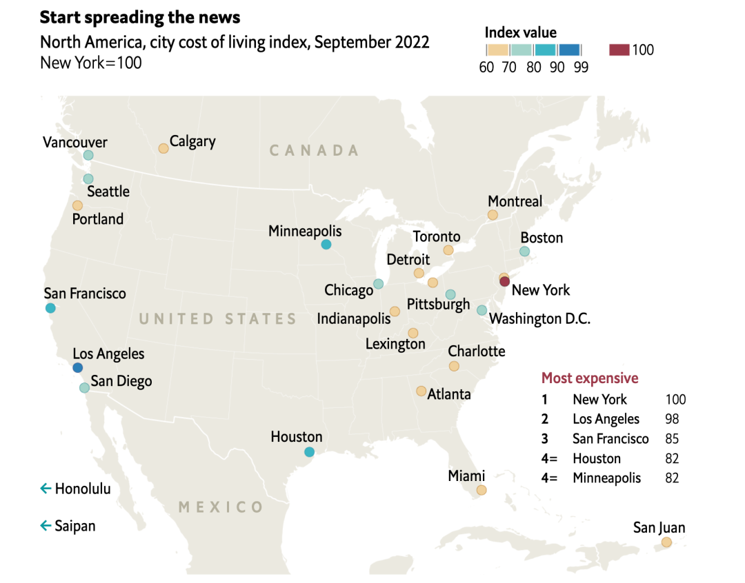 由于全球经济从新冠大流行中复苏过来,以及与俄乌战争导致的能源供应链问题,全球的生活成本正在上升。同时,在美联储不断加息的推动下,强势美元也推动了美国城市排名的上升。
