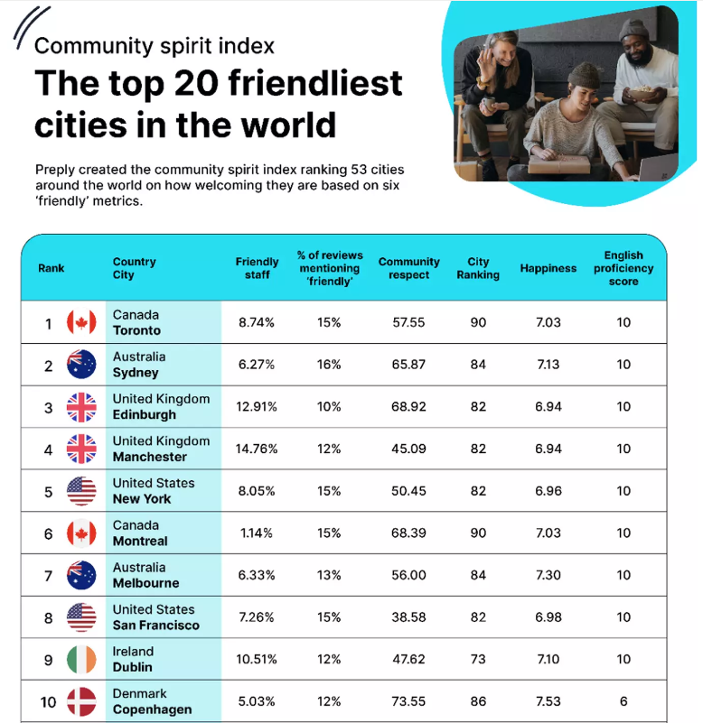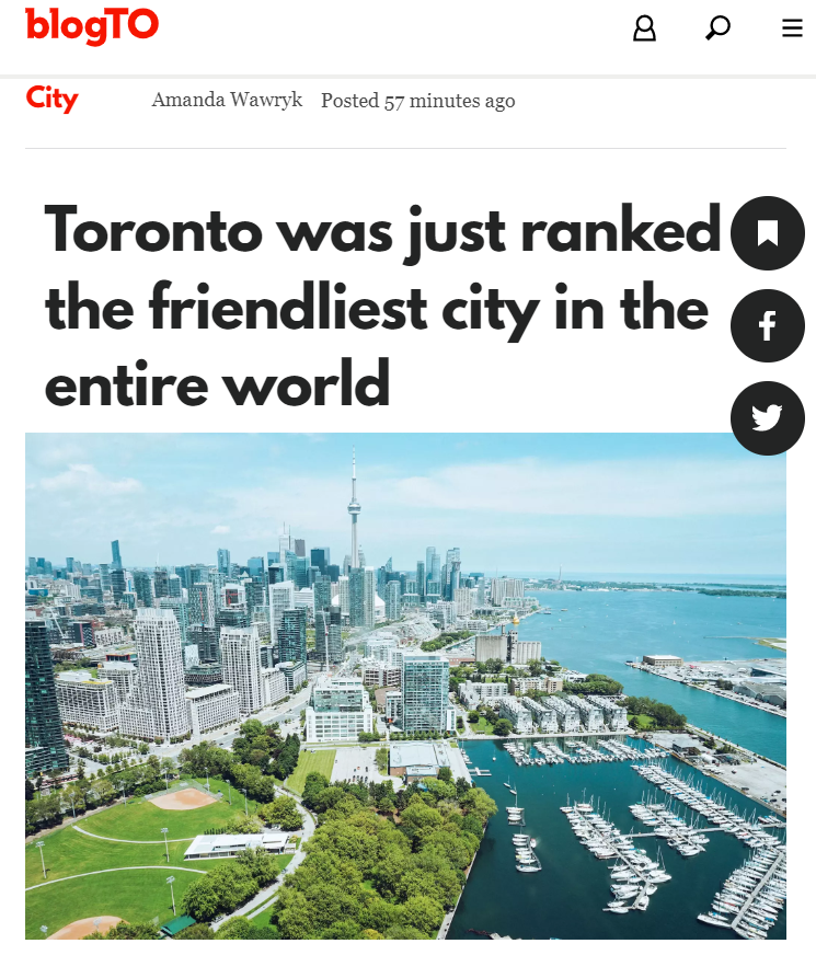一个也许会让大家惊讶的新数据显示,多伦多是世界上最友好的城市,与澳大利亚的悉尼并列第一。