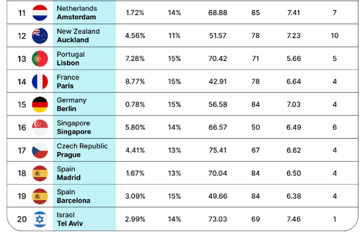 除了以上两个城市,加拿大就没有其他进入前20名的城市了。不过遗憾的是,中国没有任何城市在此次的榜单中。